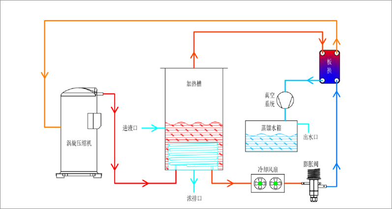 通過渦旋壓縮機(jī)從水蒸氣中吸收能量給廢液加熱,既提供了蒸發(fā)所需的熱量,又提供了水蒸氣冷凝所需的冷量,從而大幅提高了蒸發(fā)效率。