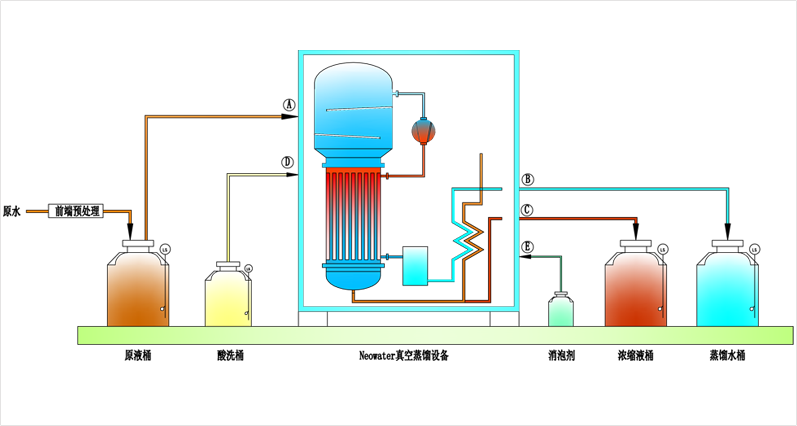真空蒸餾機組每個模塊單元由進口壓縮機、蒸發(fā)冷凝系統(tǒng)、智能化微電腦控制系統(tǒng)、預(yù)熱換熱器、控制閥門傳感器、單元外殼等構(gòu)成。Neowater真空蒸餾設(shè)備模塊集成度更高、體積更小、外觀更加精致。