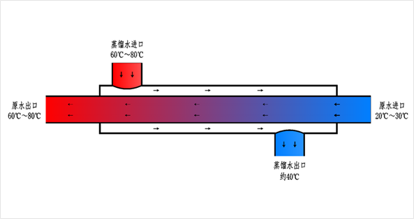 該系統(tǒng)通過多級換熱的方式吸收蒸餾水的富余熱量來預(yù)熱污水,從而使蒸餾水的出水溫度從100度降至50度以下,大大降低了系統(tǒng)能耗。